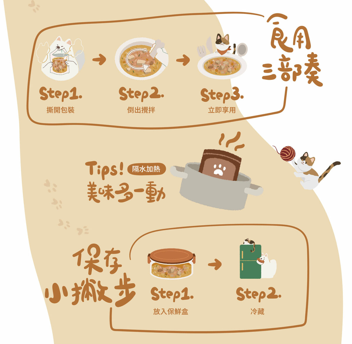 開袋即嚐:撕開包裝,開封即食,倒入碗中,快速上桌。(建議也可與飼料攪拌搭配喔)
