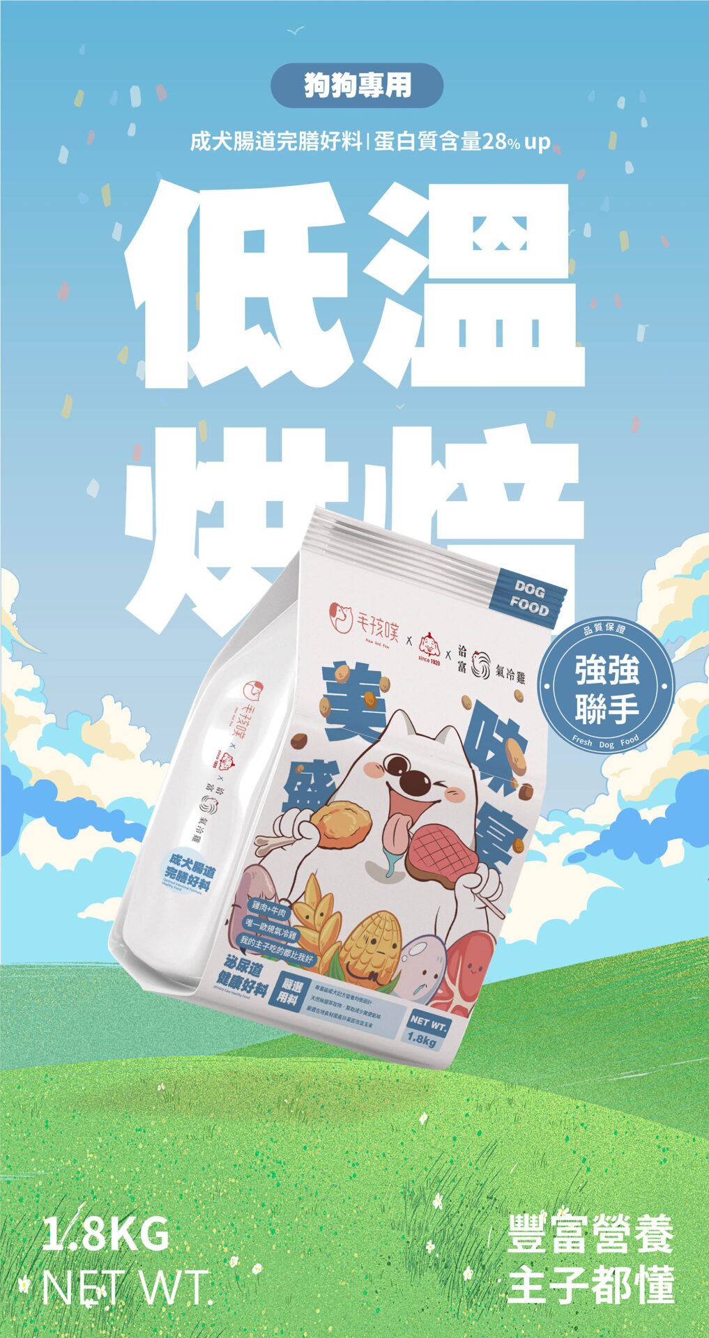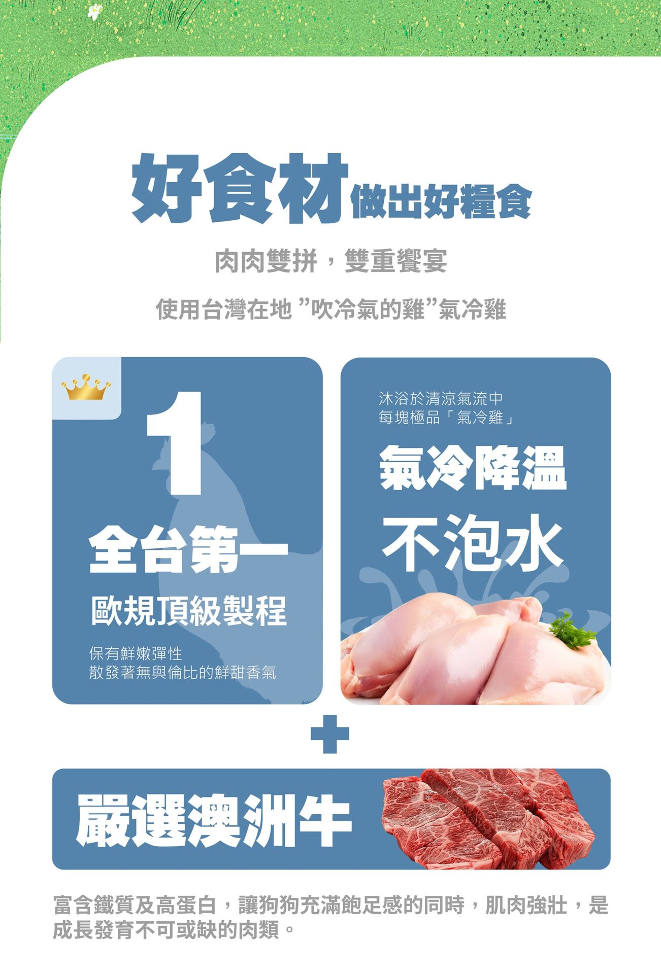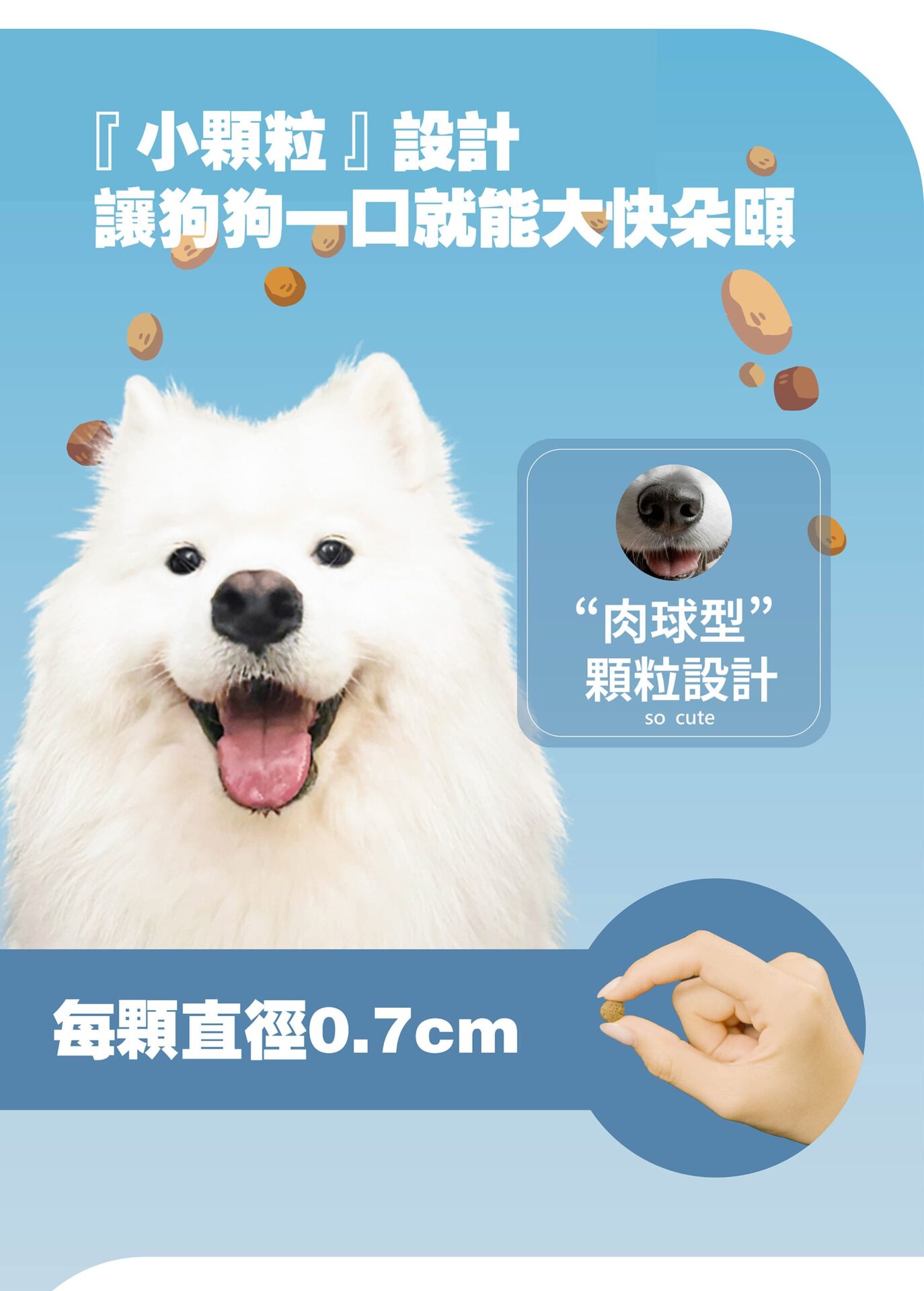 雞肉粉、新鮮魚粉、全麥、珍珠大麥、國產非基改玉米、乾燥全蛋、乾燥酵母 、胜肽蛋白、牛磺酸、絲蘭精華、乾甜菜、菜越黃(OPC來源) 、益生菌 (嗜酸乳桿菌)、綜合給生素、綜合礦物質。